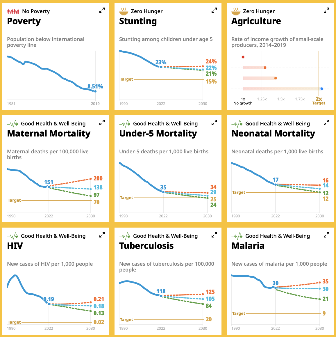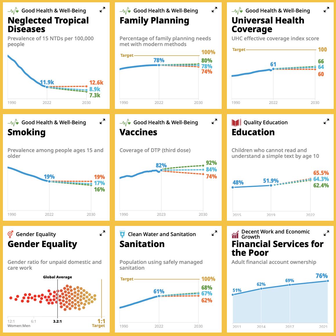 Consultez ces tableaux en version interactive pour 18 indicateurs des ODD 1 à 6 et 8 sur le site de la Fondation Bill & Melinda Gates.