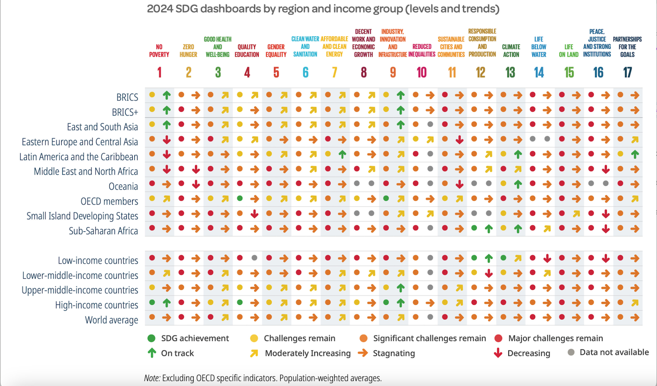 Les pays nordiques continuent de dominer l’indice des ODD, avec la Finlande en tête, suivie de la Suède, du Danemark, de l’Allemagne et de la France (voir le profil complet de la France). Toutefois, même ces pays rencontrent des difficultés à atteindre certains objectifs. En revanche, les pays des BRICS (Brésil, Russie, Inde, Chine et Afrique du Sud) et BRICS+ (Égypte, Éthiopie, Iran, Arabie saoudite et Émirats arabes unis) affichent une progression significative, dépassant la moyenne mondiale. Cette progression est toutefois moins marquée pour les pays les plus pauvres, notamment les petits États insulaires en développement (PEID), qui accusent un retard croissant.