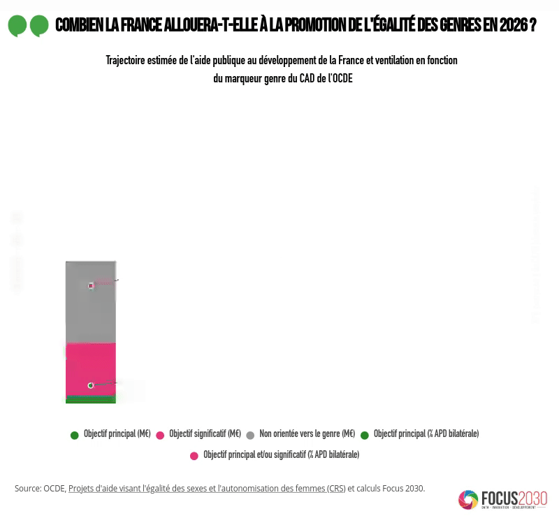 - L’OCDE publie chaque année les données sur l’aide publique au développement analysée selon le « marqueur genre ». Ainsi en 2022-2023, 45,8 % des engagements d’aide bilatérale ventilable des pays du CAD avaient l’égalité entre les sexes et l’autonomisation des femmes pour objectif principal ou significatif.