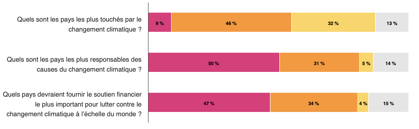 Quels sont les pays les plus touchés par le changement climatique ? Quels sont les pays les plus responsables des causes du changement climatique ? Quels pays devraient fournir le soutien financier le plus important pour lutter contre le changement climatique à l’échelle du monde ? Tout cocher /Tout décocher