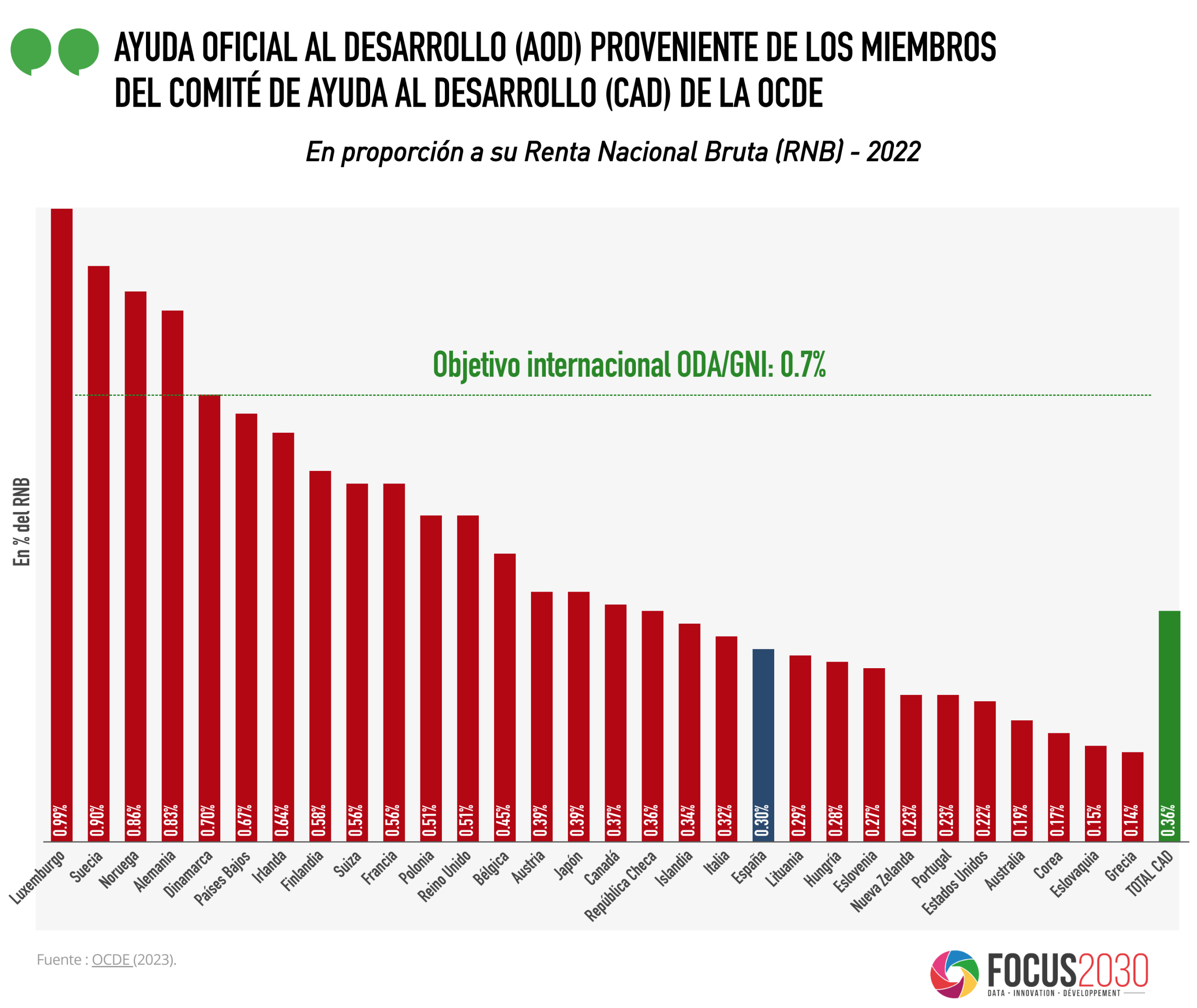 La suma de la AOD desembolsada por todos los países del CAD en 2022 equivale a un 0,36 % de la RNB agregada de estos países. Si bien no se alcanzaba este ratio AOD/RNB desde el año 1982, todavía se encuentra muy alejado del compromiso del 0,7 % adoptado en 1970 por los países industrializados frente a las Naciones Unidas.