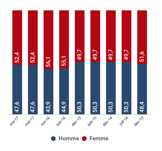 Below are details for each category used to ensure that the selected sample (on average 6133 respondents for each survey wave, twice a year since 2013) is able to accurately represent the French population.