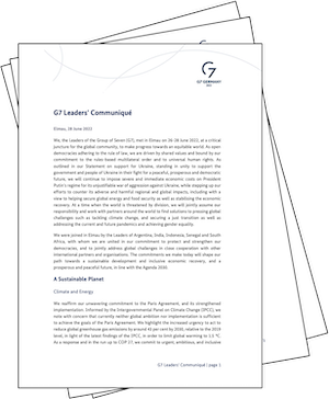 Focus 2030 se propose de faire la synthèse des engagements nouveaux ou réaffirmés des membres du G7, mais également des réactions ayant précédé la sortie du communiqué.