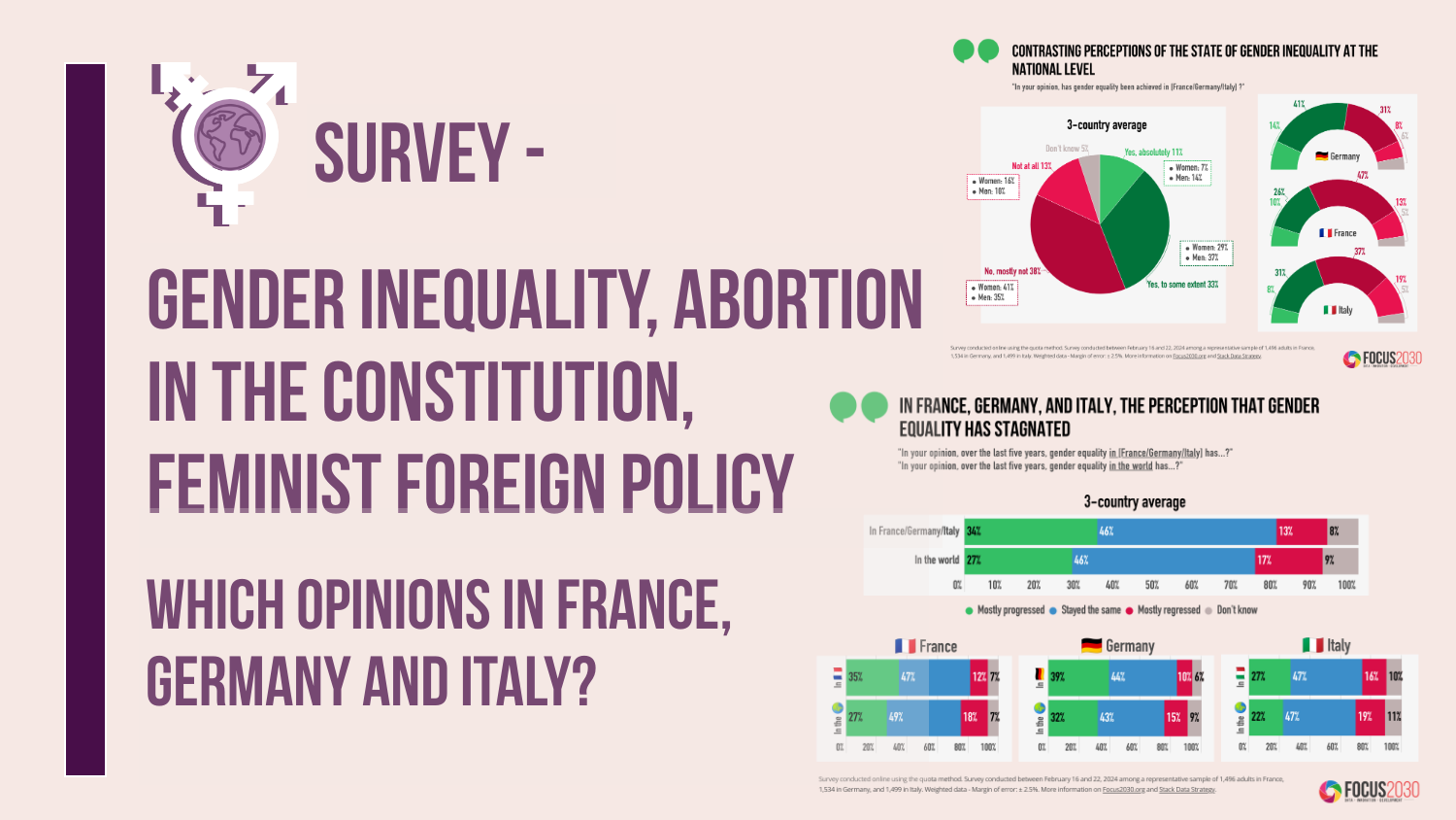 In the run-up to March 8, 2024, Focus 2030 commissioned Stack Data Strategy to survey people in France, Germany and Italy on the state of gender inequality in their countries and around the world, and on what needs to be done about it.