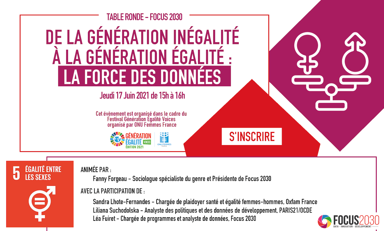 À l’occasion du Festival d’engagement citoyen Génération Égalité Voices, organisé par ONU Femmes France, et à quelques jours du Forum Génération Égalité (du 30 juin au 2 juillet à Paris), Focus 2030 vous invite à assister à une table ronde en ligne sur la nécessité de données fiables sur le vécu et les aspirations des filles et des femmes à travers le monde :