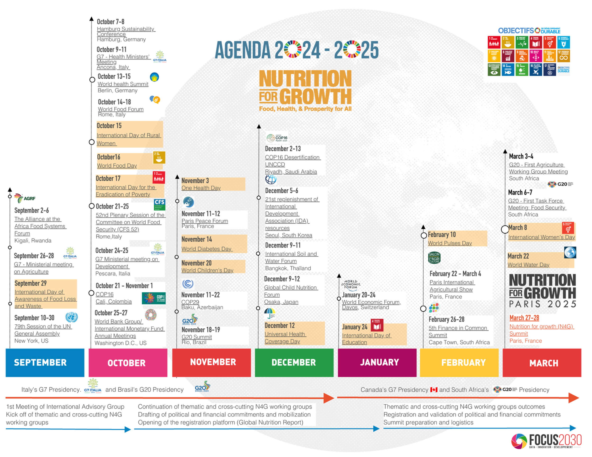 Discover in this timeline all the major international events in 2025 related to the fight against malnutrition in the world, in the lead-up to the Nutrition for Growth Summit (N4G) taking place on March 27-28, 2025, in Paris.