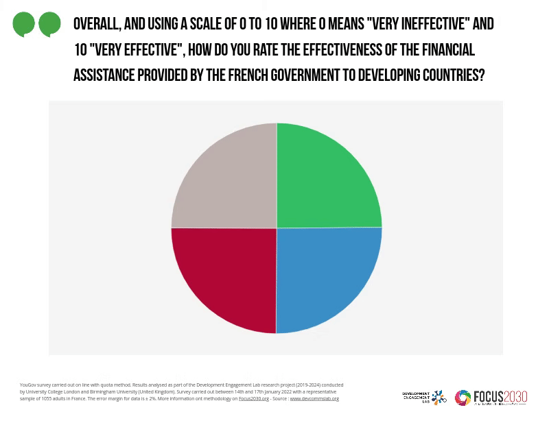 French people are harsh judges of the effectiveness of Official Development Assistance (ODA). When asked, only 13% declare they believe ODA to be effective, compared to 22% who say it is ineffective.