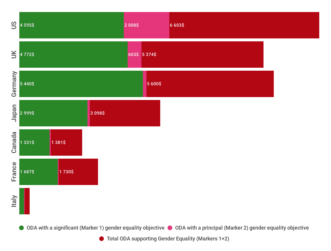 In terms of volume, the largest ODA donors to gender equality are also the largest donors of total ODA (Germany, Japan, USA, France).