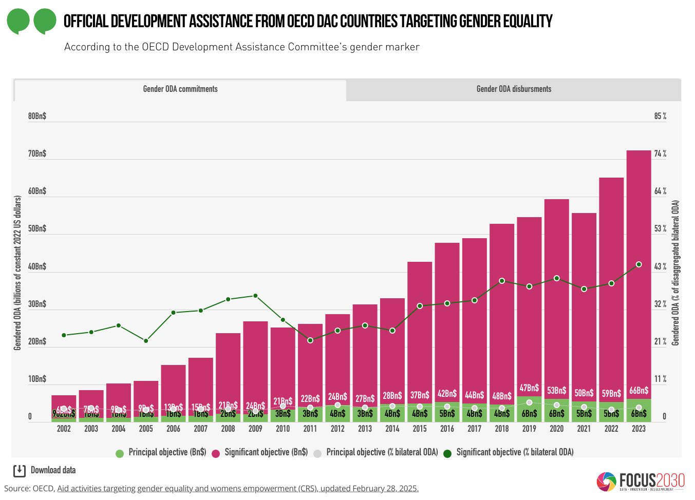 On August 4, 2021, France enacted a new law to frame its development aid policy : the Programming Law on Solidarity-Based Development and the Fight Against Global Inequalities. This law enshrines gender equality between women and men, and girls and boys, as a cross-cutting objective of French ODA. It stipulates that by 2025, 75% of projects funded by French ODA should have gender equality as either a principal or significant objective (according to the OECD gender marker), with 20% having it as the principal objective. This commitment could translate into €3.3 billion allocated to the direct promotion of gender equality in 2025, a sum five times higher than that dedicated in 2021. However, since 2024, France has implemented massive cuts to its ODA, making this goal appear unattainable today.