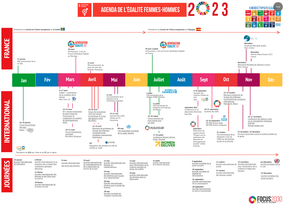Retrouvez dans cette timeline ou agenda féministe 2023, tous les grands temps forts internationaux en lien avec l’atteinte de l’Objectif de développement durable n°5 - Parvenir à l’égalité des sexes et autonomiser toutes les femmes et les filles.